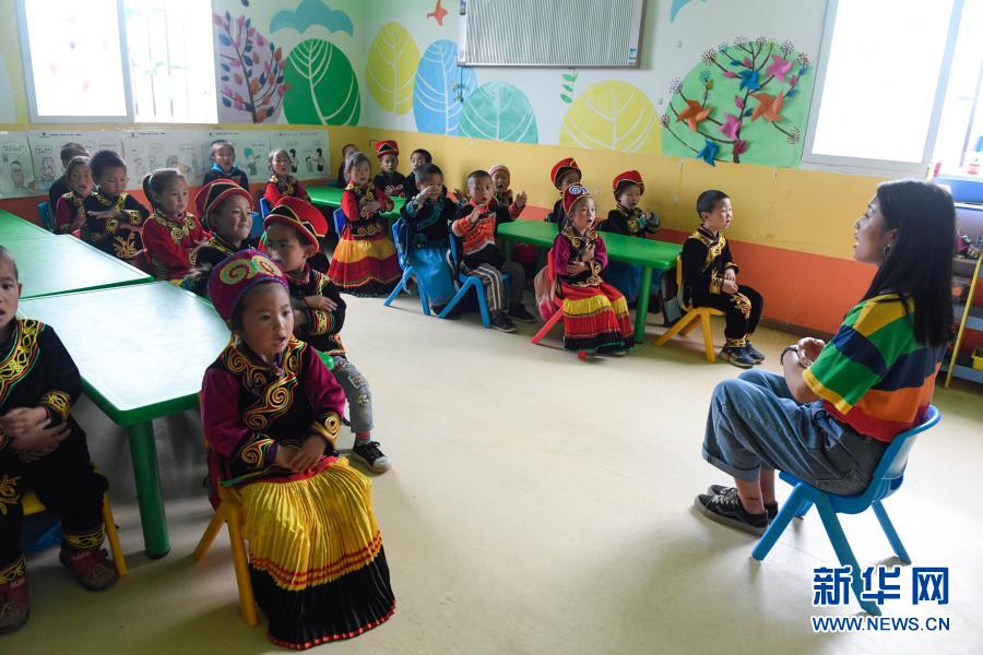 在四川省雷波縣莫紅鄉三峽新村幼兒園,老師教孩子們用普通話唱歌(2019年5月14日攝)。新華社記者 江宏景 攝