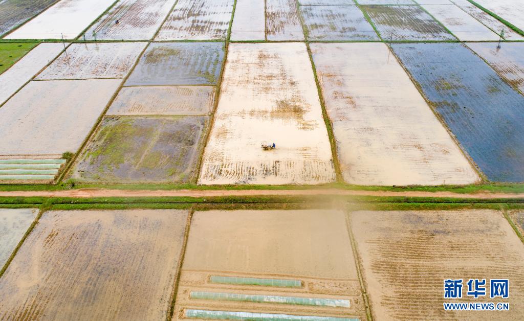 4月5日,江西省新余市渝水區南安鄉朝陽村農機手駕駛微農機翻耕水田(無人機拍攝) 。