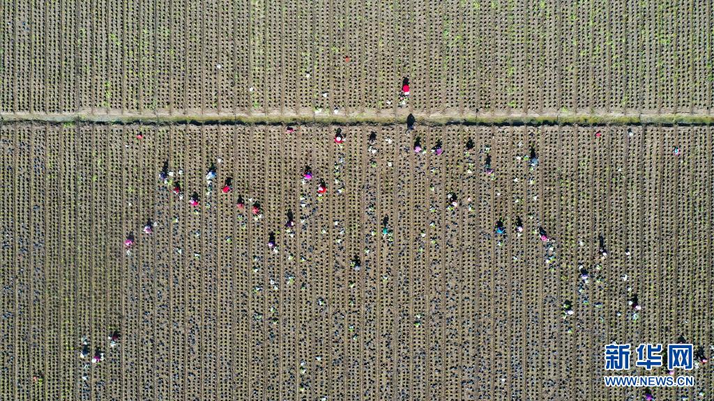 4月5日,江蘇省宿遷市沭陽縣劉集鎮南長莊村農民在田間勞作(無人機照片)。
