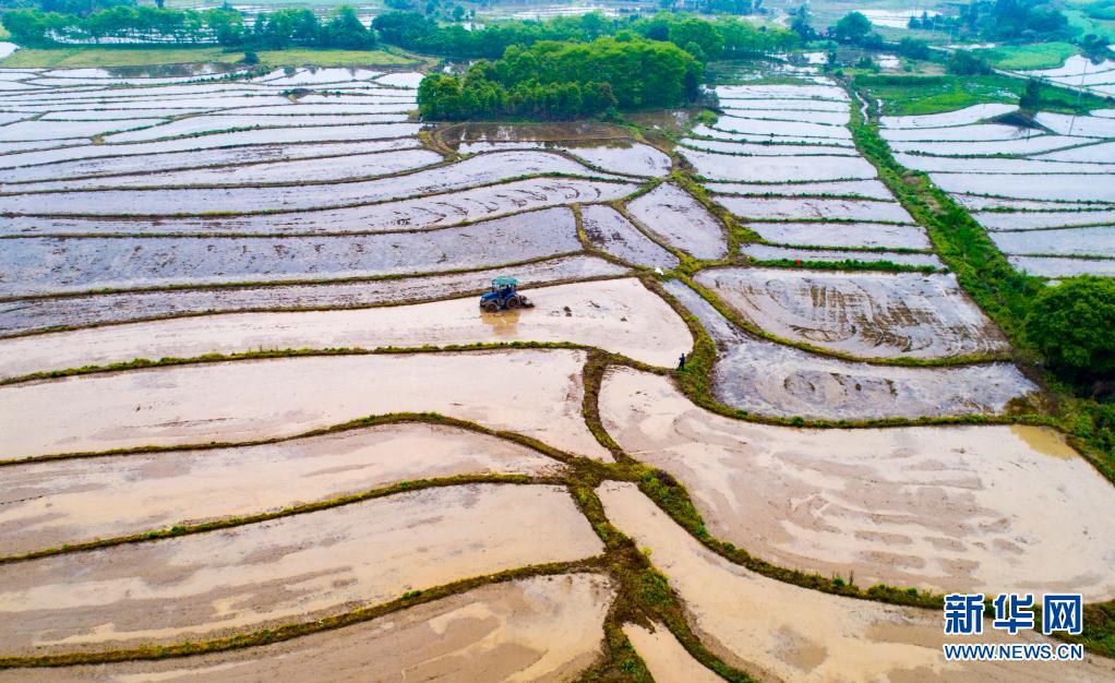 4月6日,江西省新余市仙女湖區(qū)鈐陽辦事處白田村農(nóng)民駕駛農(nóng)機耙田、施肥,為早稻插秧作準(zhǔn)備(無人機拍攝)。