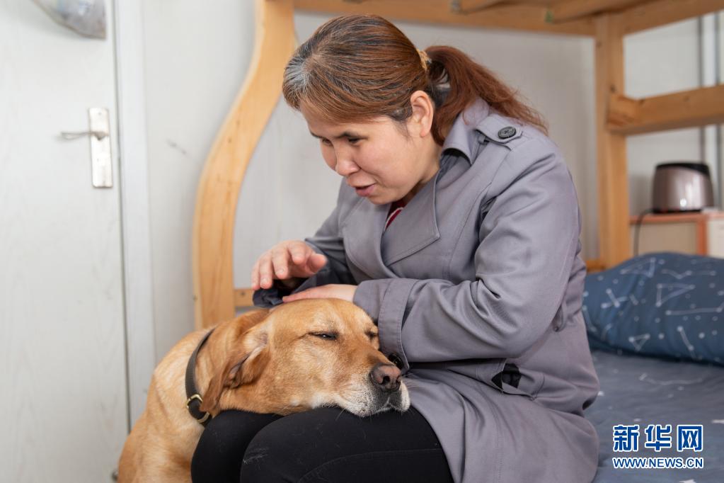 導(dǎo)盲犬“多多”經(jīng)常會把頭放在祝愛葉腿上,祝愛葉一邊撫摸著它的頭一邊和它說說心里話(4月26日攝)。 新華社發(fā) (張夢 攝)