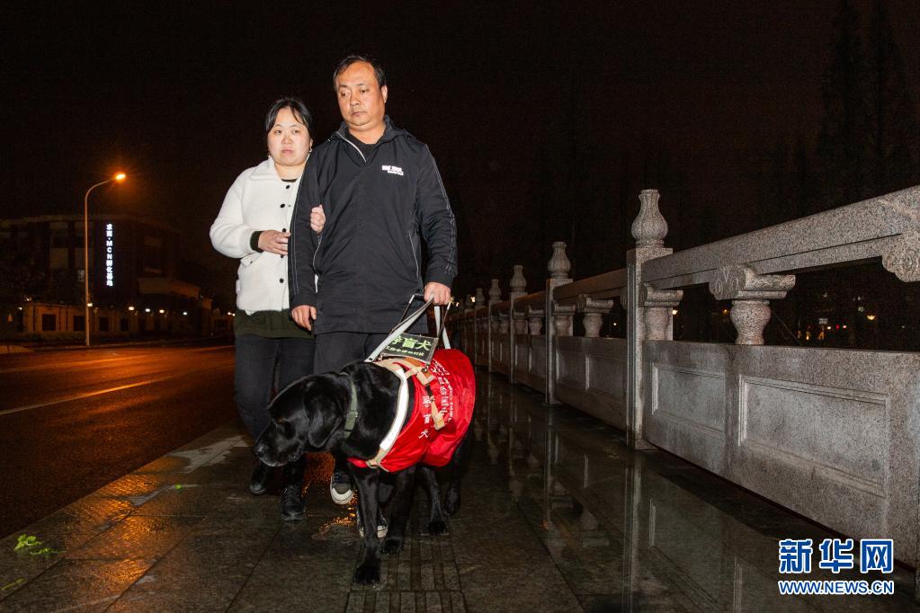 4月11日晚,妻子挽著吳虎剛,吳虎剛牽著“C羅”,共同走在下班回家的路上。 新華社發 (張夢 攝)