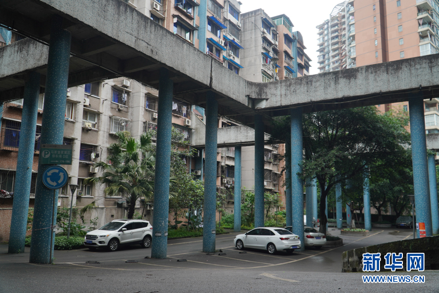 據了解,該小區位于重慶市渝中區長江二路。通過這個空中走廊,居民可以直接走到和天橋齊平的街道上去。新華網 耿駿宇 攝