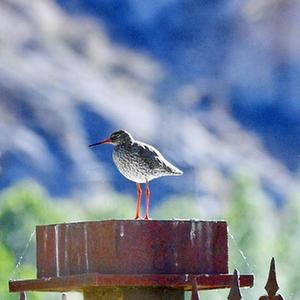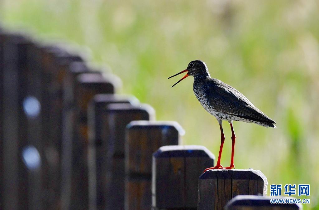 在拉魯濕地人行步道欄桿上鳴叫的紅腳鷸(6月2日攝)。
