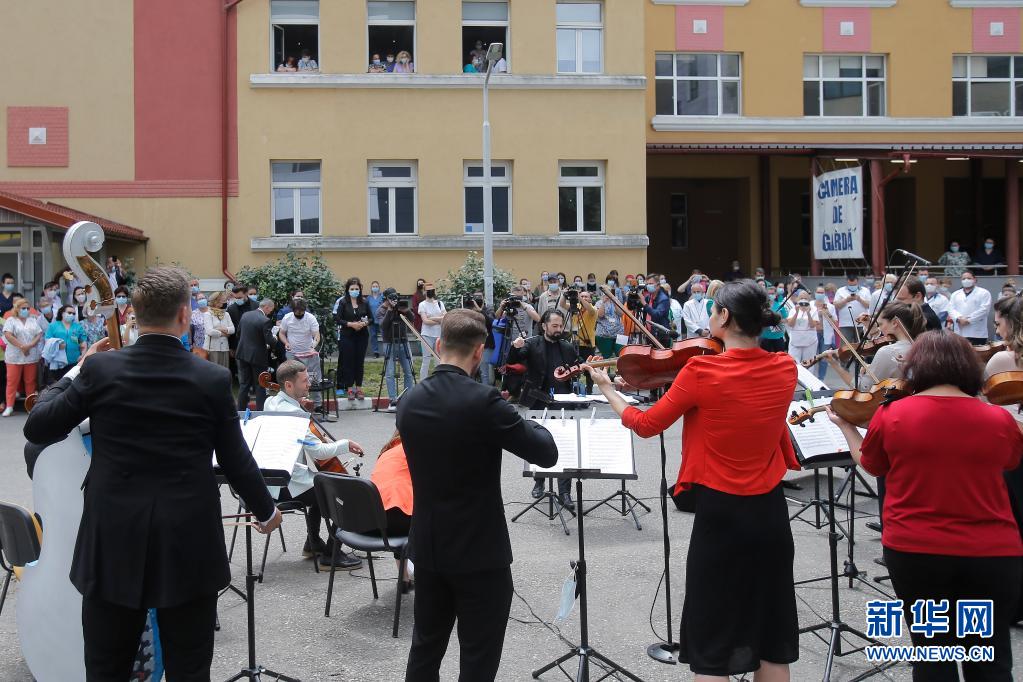 當日,羅馬尼亞首都布加勒斯特一個樂隊在該國一家傳染病醫院——馬太·巴爾什醫院演出,向抗擊新冠疫情的醫務工作者致謝。