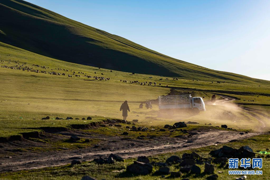 新疆裕民縣巴爾魯克山區夏牧場景觀(6月15日攝)。如今,牧民放牧條件得以改善,摩托車、汽車更多地出現在牧場上。