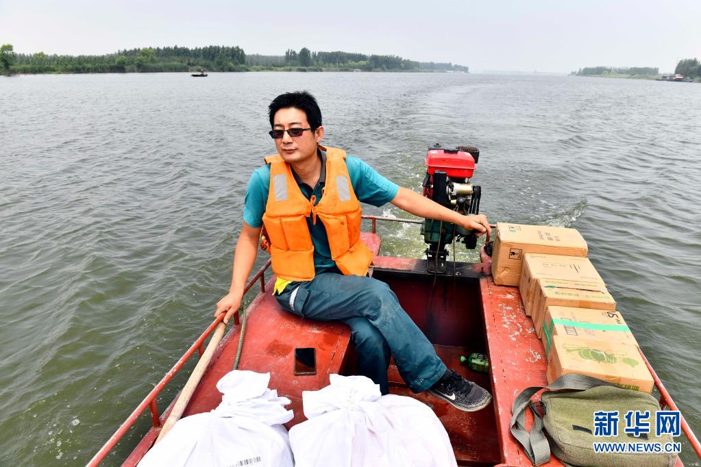 6月20日,在微山縣南陽鎮,郵遞員王少朋駕駛郵船為村民投遞郵件。