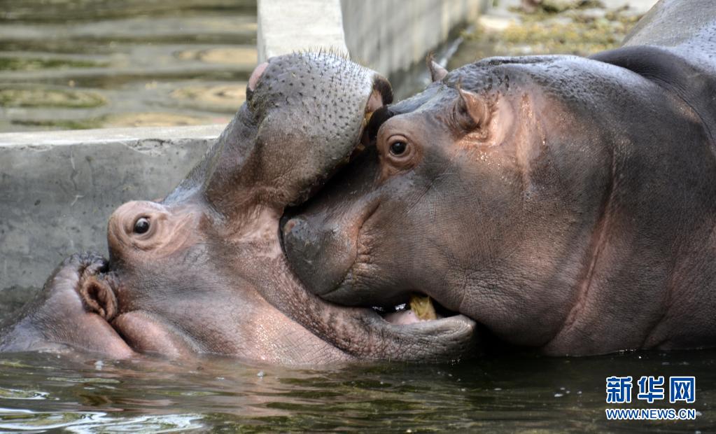 北京動物園河馬館內的河馬在嬉戲(6月28日攝)。