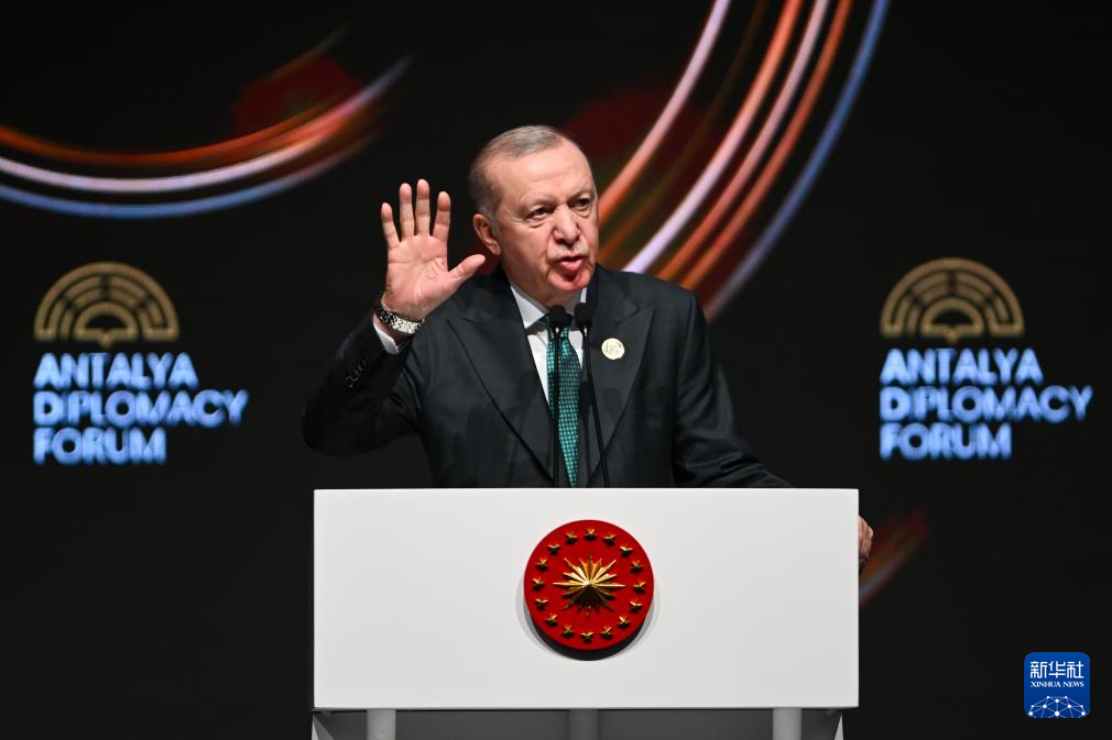 4月17日,土耳其总统埃尔多安在土耳其安塔利亚举行的第五届安塔利亚外交论坛开幕式上发表讲话。新华社发(穆斯塔法·卡亚摄)
