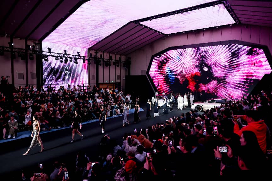 大秀现场,享界S9T星玫粉、S9月绒白化身时尚单品,与高定服饰同台闪耀。模特身着以车色为灵感的定制华服穿梭于车身之间,车身线条、漆面质感与服饰肌理、色彩情绪同频共振,搭配璀璨星河大灯随秀场节奏变换光影,生动演绎“人车共生”的美学格调,为现场带来一场融合科技与时尚的感官盛宴。