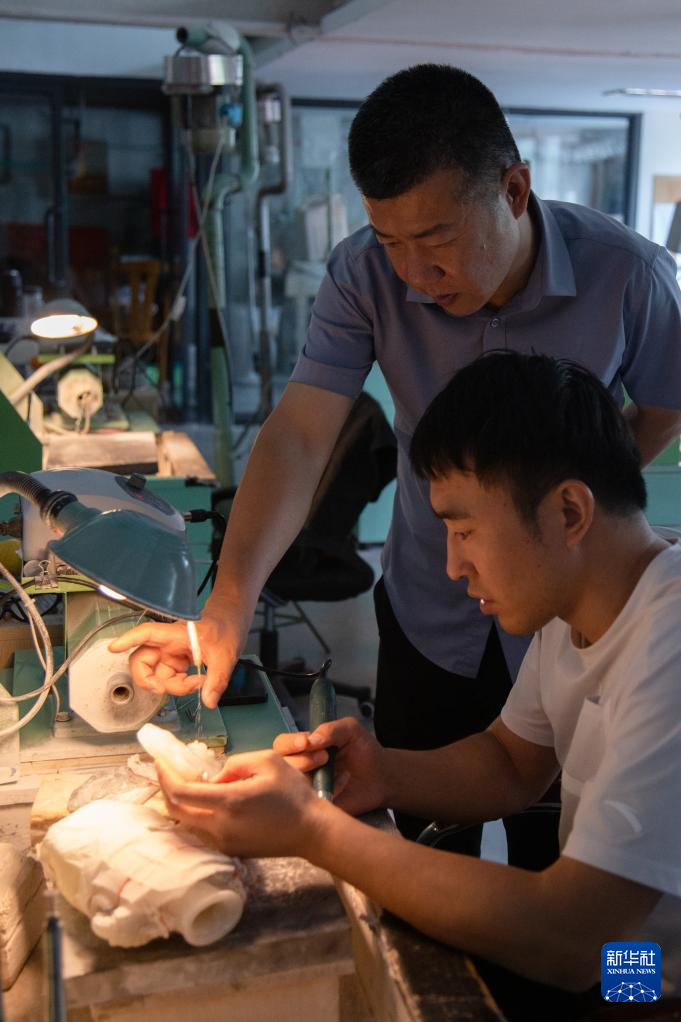 张铁成(左)在工作室内和技师一起进行玉雕技术研究(6月15日摄)。
