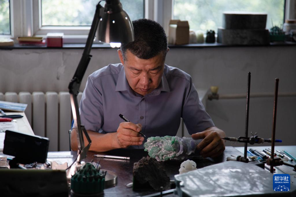 张铁成在工作室内进行玉雕创作(6月15日摄)。