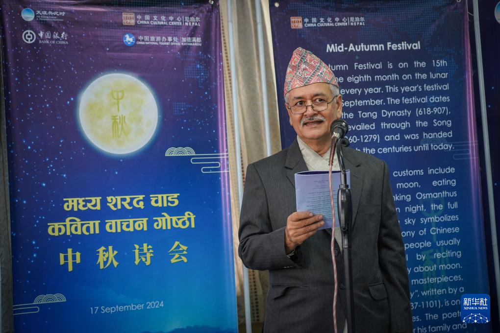 9月17日,在尼泊尔首都加德满都,一名男子在“天涯共此时——中秋诗会”上朗诵诗歌。新华社发(哈里·马哈尔詹摄)