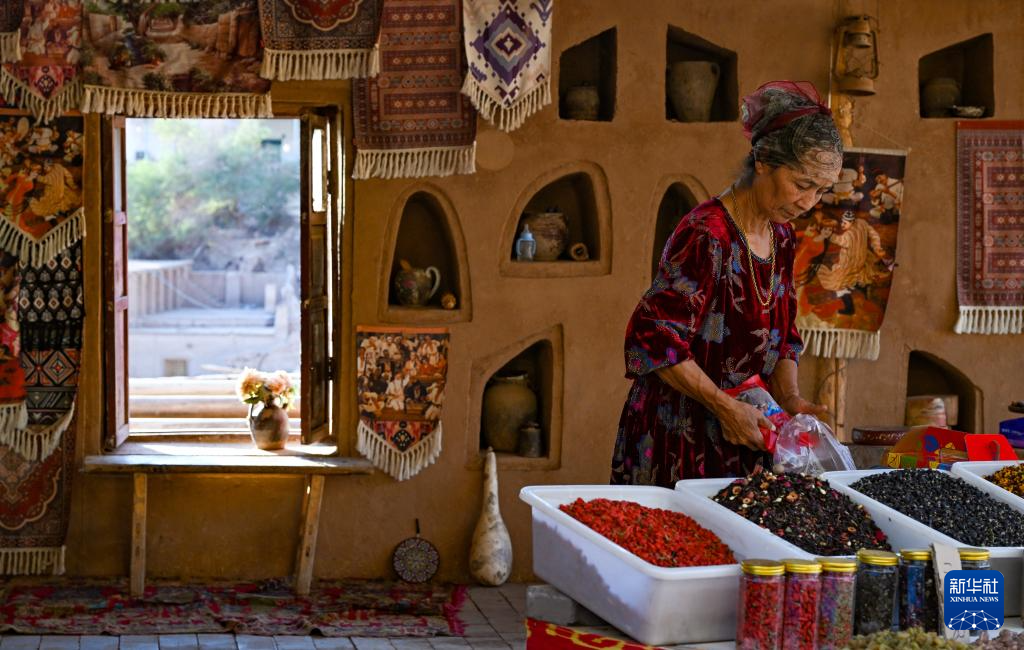 村民茹柯耶·艾合买提在吐峪沟景区内售卖杏干水(10月7日摄)。