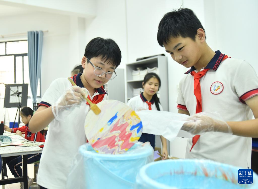 10月10日,在梧州市长洲区凤翔小学,学生们在非遗课堂上制作漆扇。