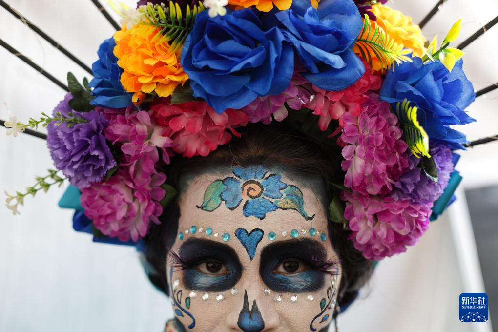 这是11月2日在墨西哥首都墨西哥城拍摄的亡灵节游行现场。