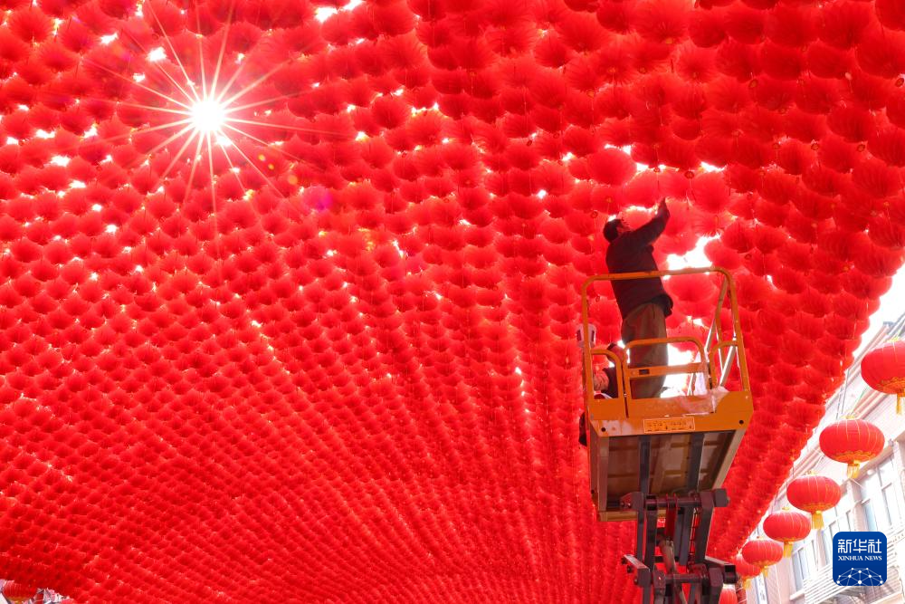 1月22日,在山东省枣庄市矿区街道东花园社区,工作人员在悬挂灯笼。