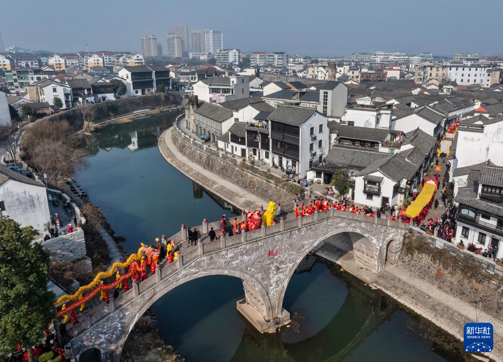 1月22日,浙江省诸暨市枫桥镇的民俗表演巡游队在穿街巡游(无人机照片)。