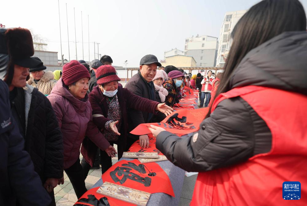 1月22日,在山东省临沂市沂南县辛集镇文化广场,书法志愿者为群众免费书写春联。