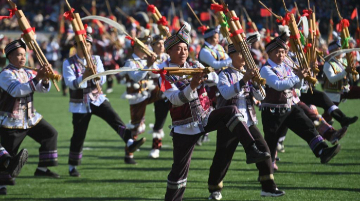 11月29日,表演者在融水县民族体育公园举行的芦笙斗马节开幕式现场吹奏芦笙。