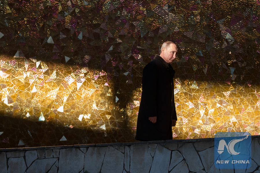 Russian President Vladimir Putin leaves after laying a wrath to the eternal flame in Volgograd, on Feb. 2, 2018. (Xinhua/Bai Xueqi)