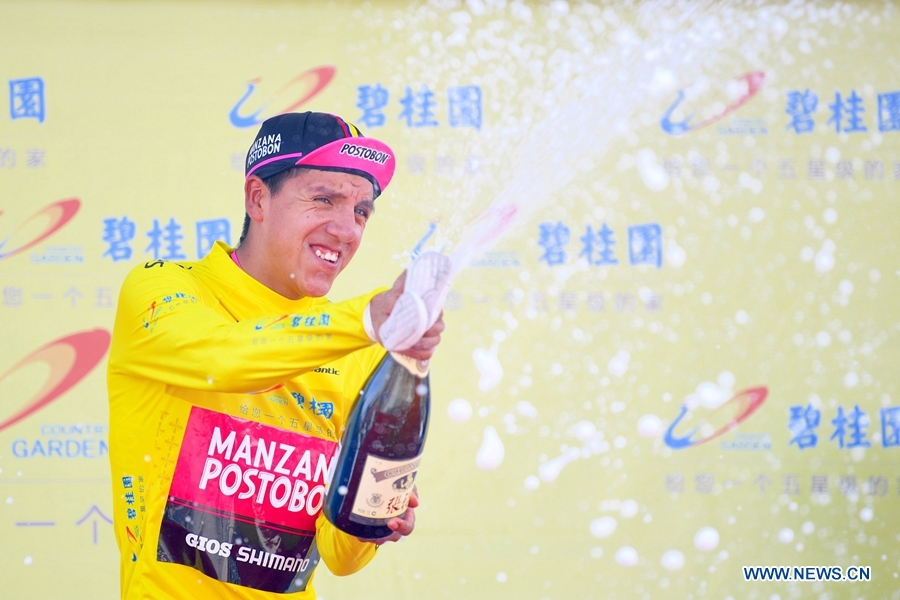 Hernan Aguirre from Manzana Postobon celebrates with the yellow jersey at the award ceremony of the twelfth stage of the Tour of Qinghai Lake in Yinchuan, northwest China's Ningxia Hui Autonomous Region, on August 3, 2018. (Xinhuanet Photo by Pan Binbin)