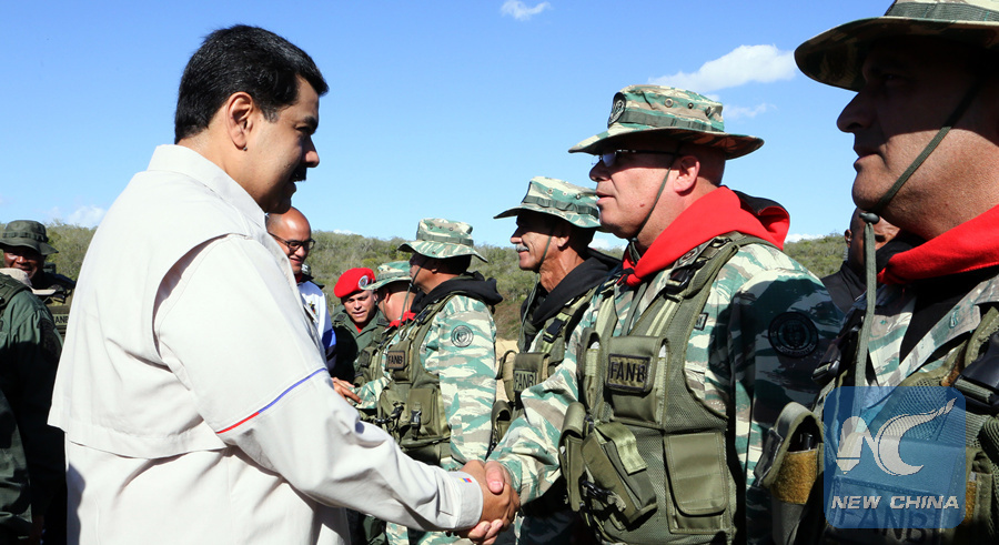 Venezuelan President Nicolas Maduro (L) greets a soldier at the Guicaipuro Fort in Miranda, Venezuela, on Feb. 10, 2019.