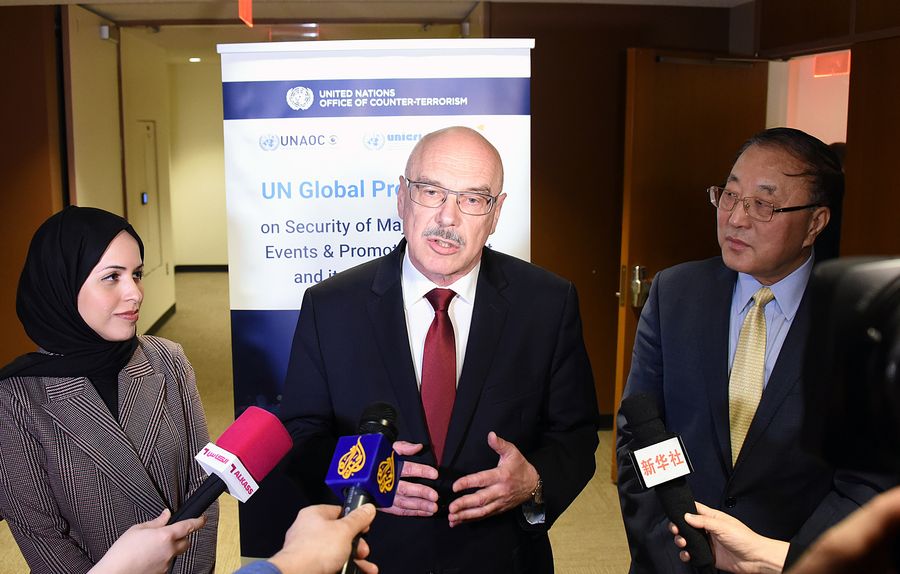 Under-Secretary-General of the UN Office of Counter-Terrorism (UNOCT) Vladimir Voronkov (C) speaks to journalists at the UN headquarters in New York, Feb. 3, 2020. (Xinhua/Wang Jiangang)