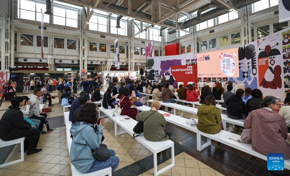 People read at the Chinese exhibition area during the 63rd Bologna Children's Book Fair in Bologna, Italy, April 13, 2026. The 63rd Bologna Children's Book Fair opened on Monday in the Italian city of Bologna. Chinese publishing houses have been showcasing a large number of children's books to promote Chinese literature to young readers on the global stage. (Xinhua/Wang Kaiyan)