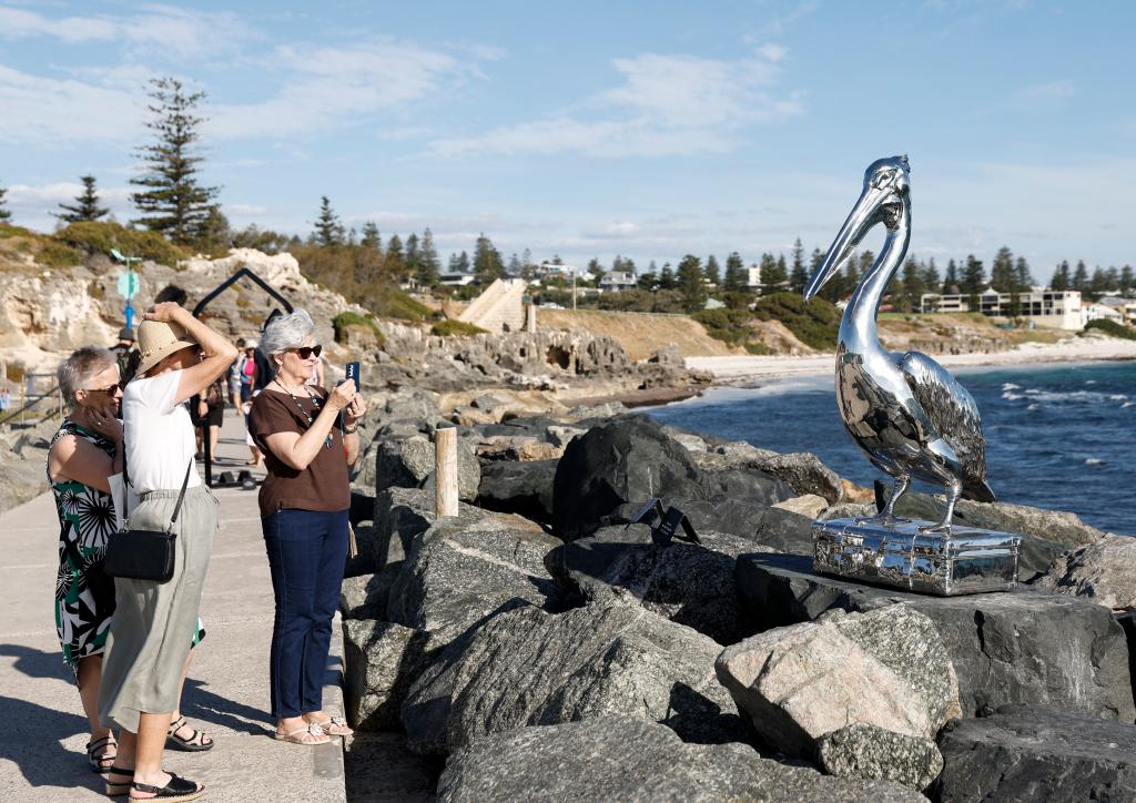 3月16日,人们在澳大利亚珀斯“海滨雕塑展”上拍摄一个鹈鹕造型的展品。