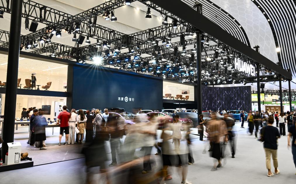这是4月13日在第六届消博会主会场拍摄的华为展台。