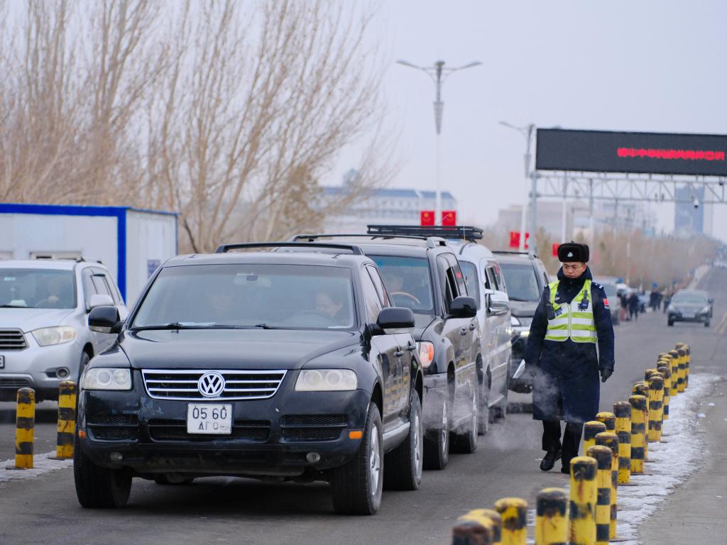 2025年12月22日,汽车在内蒙古二连浩特公路口岸等待出境。新华社记者 马金瑞 摄