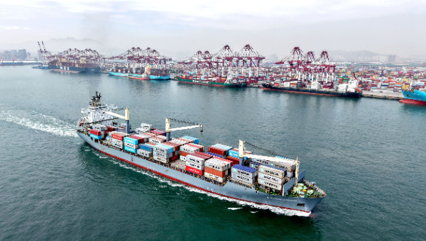 图为4月14日,在山东港口青岛港,装载外贸集装箱的货轮驶离港口(无人机照片)。新华社发(俞方平 摄)