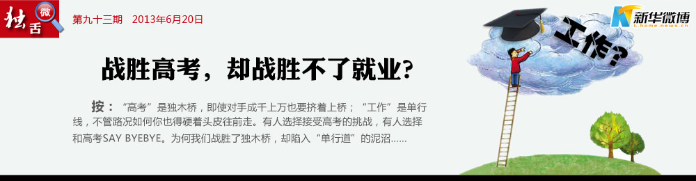 “就業”的意義 高考不再獨尊,學歷不是唯一。多元的教育模式培養多元的人才,全新的評價體系造就各路英雄。高考神馬終歸是浮云,養家糊口才是終極目標。這即是“就業”的意義。
