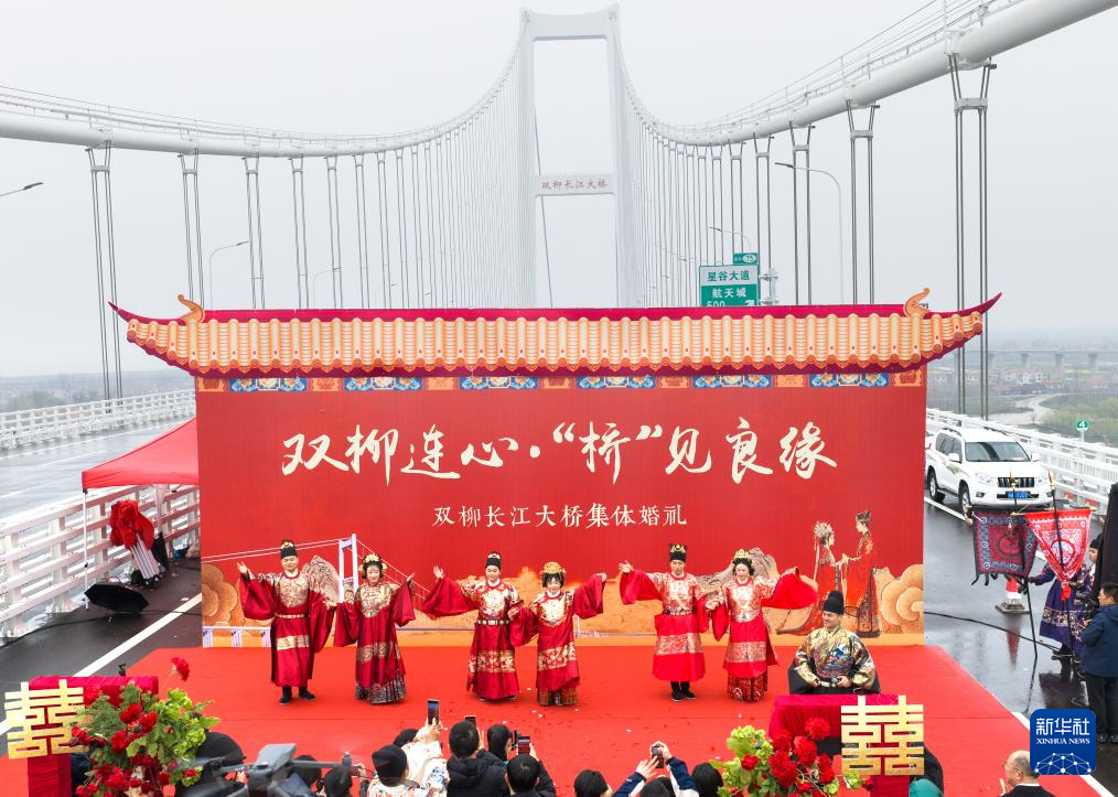 3月18日在位于湖北武汉的双柳长江大桥建设工地拍摄的新人集体婚礼仪式现场。