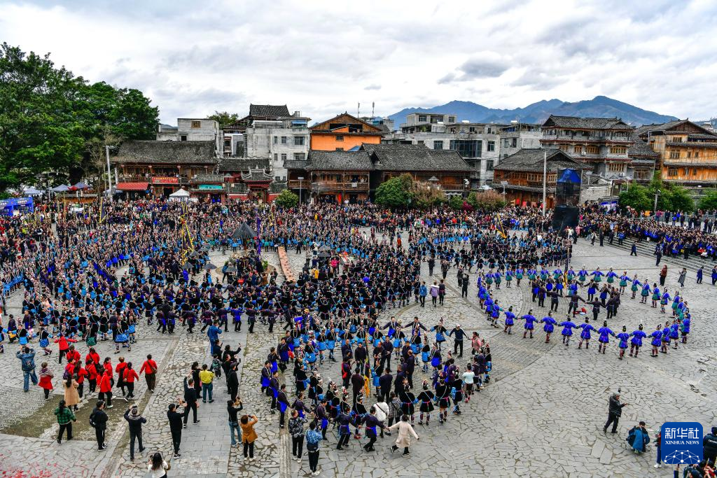 3月28日,侗族群众在贵州省榕江县三宝侗寨“萨玛节”活动中跳多耶舞(无人机照片)。