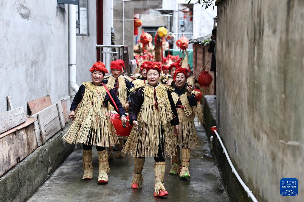 3月28日,在贵州省榕江县三宝侗寨,侗族妇女身着稻草衣参加“萨玛节”活动。