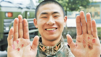 ??? 武警四川省總隊(duì)樂山市支隊(duì)官兵在嚴(yán)格訓(xùn)練中得到鍛煉。圖為2014年12月14日,戰(zhàn)士楊忠微笑著展示自己的訓(xùn)練“成果”。李華時(shí) 攝