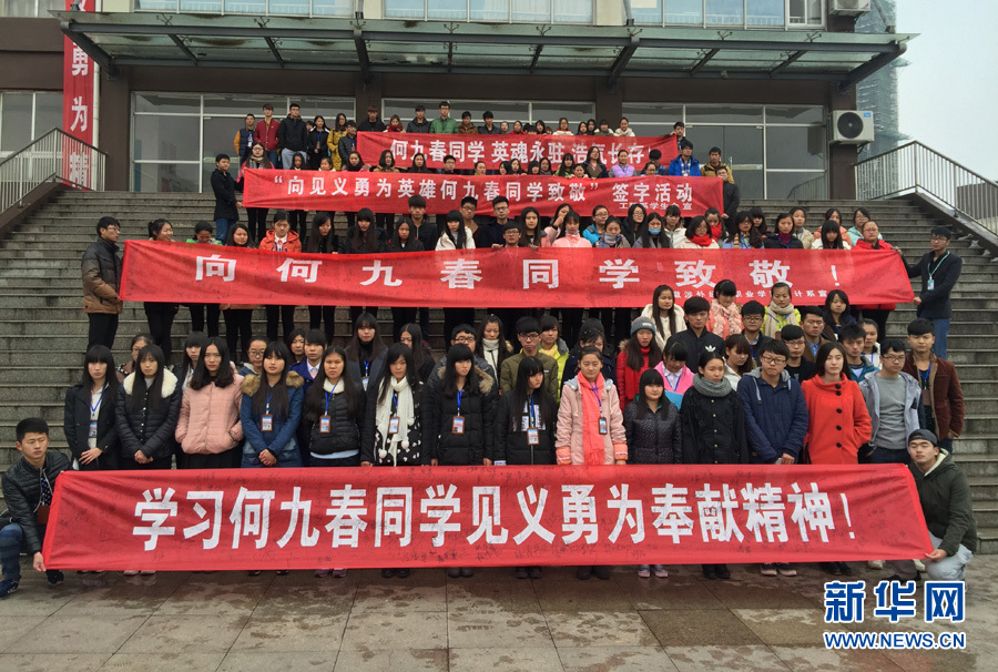 危難時(shí)刻挺身而出,英雄壯舉催人淚下。何九春的同學(xué)們紛紛自發(fā)的打出標(biāo)語(yǔ),向何九春致敬。