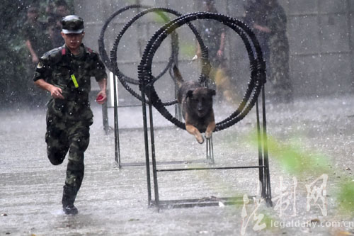 圖為訓(xùn)導(dǎo)員方加林與警犬道海在暴雨中進行穿越障礙訓(xùn)練