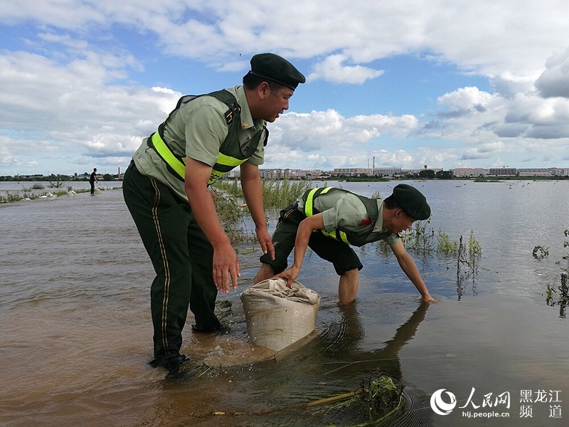 黑龍江省撫遠市鴨南鄉境內河水暴漲淹沒公路,邊防官兵緊急救援。