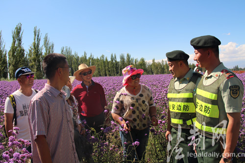 ????每年6月、7月,數萬畝薰衣草爭相怒放,匯成一片紫色的海洋,吸引大量游客前去觀賞。新疆公安邊防總隊伊犁邊防支隊梁三宮邊防派出所官兵因地制宜打造“紫郁之鄉110”這一特色警務,在治安防控、服務群眾、素質提升等方面走出了一條新路子,用使命、責任與情感為游客保駕護航,讓游客享受一趟“滿意之旅”。