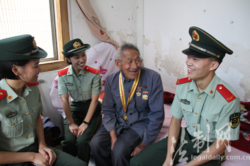 ????9月2日上午,在紀念抗日戰爭暨世界反法西斯戰爭勝利72周年之際,江蘇邊防總隊鎮江邊防檢查站揚中分站組織官兵到駐地社區看望慰問抗戰老兵倪正六老人,認真聆聽“老兵”講述當年抗戰的故事。