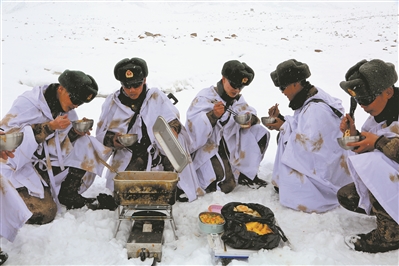 ????“凜冽寒風中,熱騰騰的揪片子,就著泡餅和鹵肉,湯湯水水,吃得真爽快!”12月中旬,新疆軍區(qū)某邊防連中士盛波和戰(zhàn)友們在高原巡邏途中吃上熱食午飯,幸福感油然而生。針對高原邊防一線部隊熱食供應難題,軍委有關部門指導一線部隊采取補充單兵自熱食品、配備高原保溫器材、革新熱食保障技術等多種方式,保障高原官兵熱食持續(xù)供應。