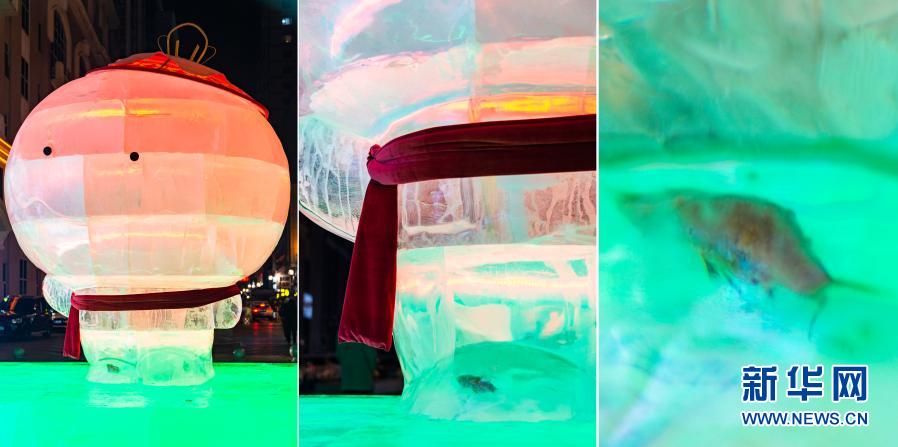 2021年1月1日,在哈爾濱中央大街一處冬奧主題的冰建景觀中,“雪容融”的右腳里有條魚(拼版照片)。有游客在發現這條魚后笑稱,這是真正的江冰。