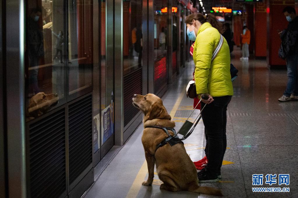 導(dǎo)盲犬“多多”陪伴祝愛葉在地鐵站內(nèi)準(zhǔn)備乘坐地鐵(3月13日攝)。  新華社發(fā) (張夢 攝)