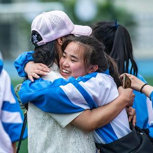 6月9日,烏當中學高三學生和家長在成人儀式上擁抱。