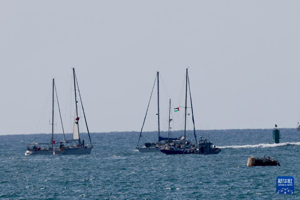 10月2日,在以色列南部阿什杜德港附近,“全球坚韧船队”船只被拖向港口。