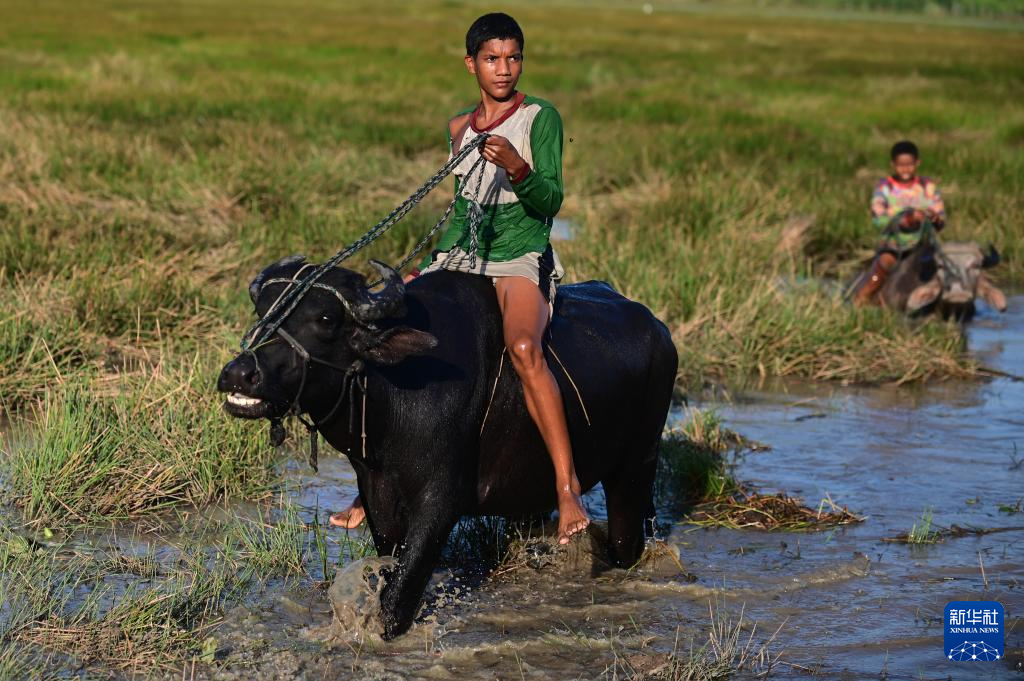 10月1日,在巴西帕拉州马拉若岛,牛仔在一处水潭里骑水牛。