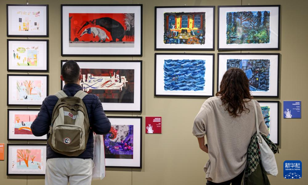 4月13日,在意大利博洛尼亚举行的博洛尼亚国际童书展上,观众欣赏插画作品。